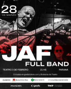 El histórico guitarrista y cantante JAF (Juan Antonio Ferreyra)** se presentará en Paraná con su formación completa para ofrecer una noche a puro rock y blues. El show será el sábado 28 de marzo a las 21:00 hs en el Teatro 3 de Febrero.